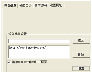 ?、谠蚴菦]有勾選自動打開網(wǎng)頁。雙擊小黃鎖或者是我行EK圖標——設置網(wǎng)址,進入下圖畫面,將我行網(wǎng)址www.cqyxyq.com添加入列表,勾選“連接USB KEY自動打開網(wǎng)頁” ,且點擊設置。