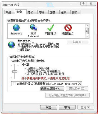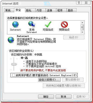 ?、苋绻莣in7或者是vista系統(tǒng),請關閉IE的保護模式,如下圖:
