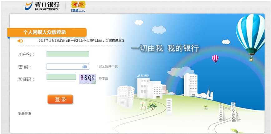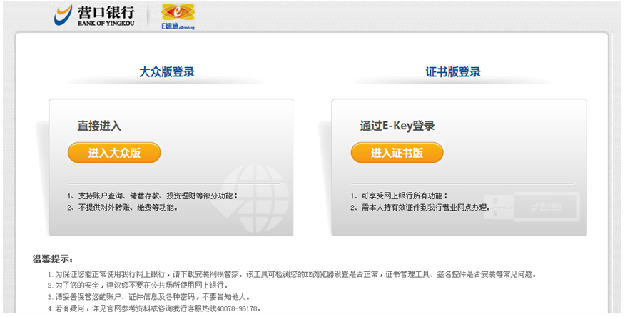 登錄營口銀行官方網(wǎng)站(www.cqyxyq.com),選擇個(gè)人網(wǎng)上銀行,點(diǎn)擊“進(jìn)入大眾版”![]() 點(diǎn)擊“進(jìn)入大眾版”后出現(xiàn)登錄頁面:![]() ![]() |